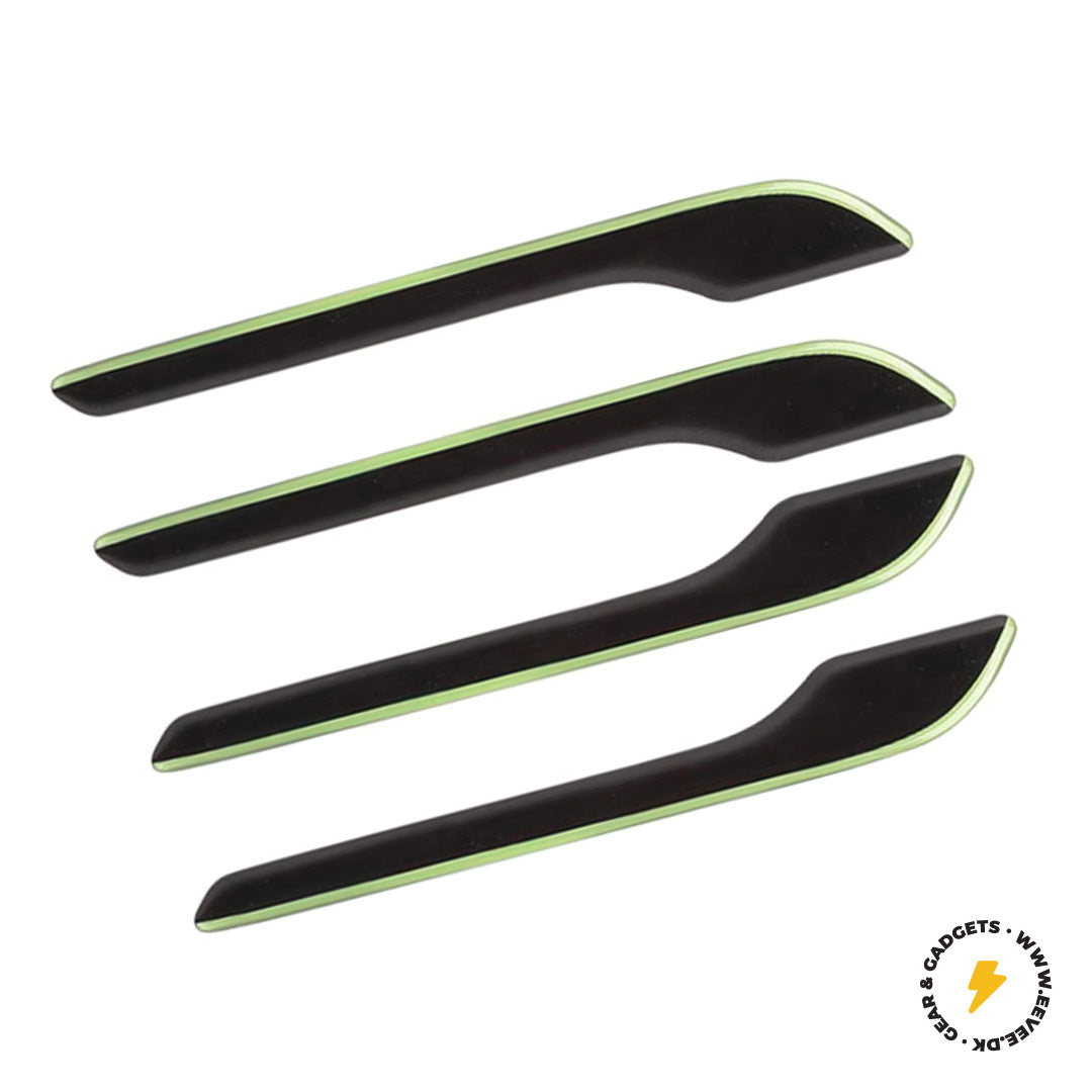 Leuchtender Griffschutz aus „fetter“ Folie. 4 Stück im Paket, passend für Tesla Model 3 und Y. Schwarze Unterseite mit leuchtendem Leuchtstreifen im Dunkeln.
